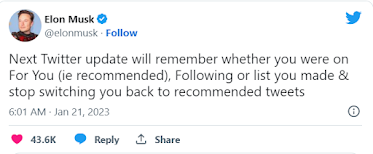 Twitter will receive an update that will allow the app to remember the last feed a user was viewing, the company's CEO Elon Musk revealed on Saturday. The microblogging service recently updated its Android and iOS apps with a "For You" feed with recommended tweets that is shown to users by default. Twitter will also allow users to bookmark tweets with a single tap from the details page. Musk also revealed that Twitter will translate and recommend tweets from users in other countries in the coming months.In a series of tweets early on Saturday, Musk said that Twitter would be updated to remember whether a user was on the recommended tweets feed (labelled For You), the Following feed, or your lists on the app and would stop switching them back to the curated feed. He also responded to a user confirming that the company is working on the ability to customise the positions of these tabs in the app.